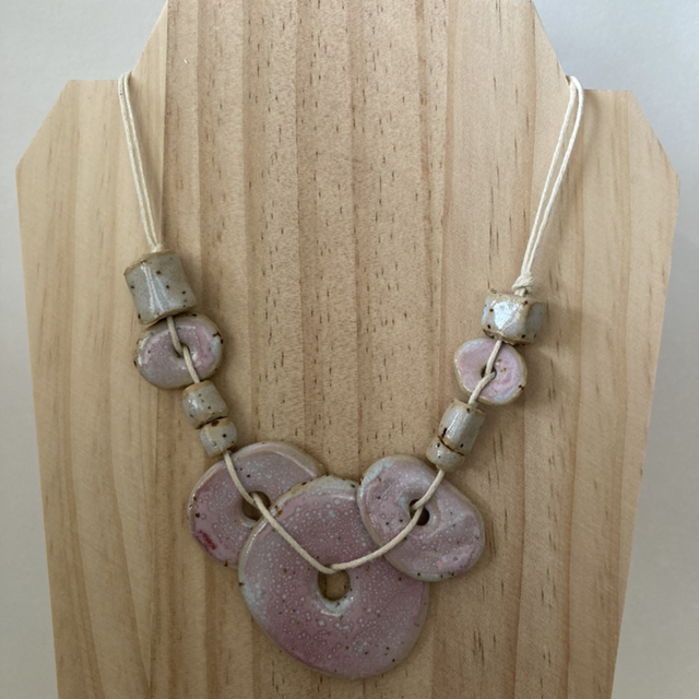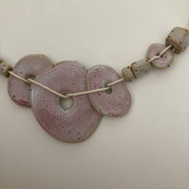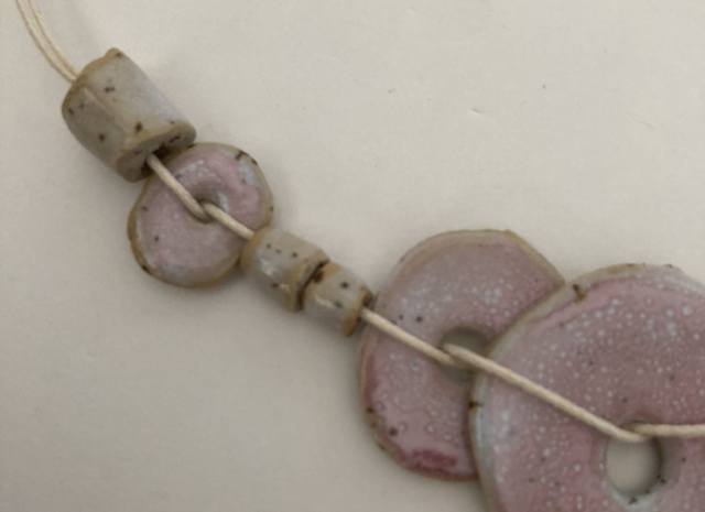 Collier unique avec des perles en grès avec pyrites émaillées (fil en coton). Longueur totale: environ 46cm.